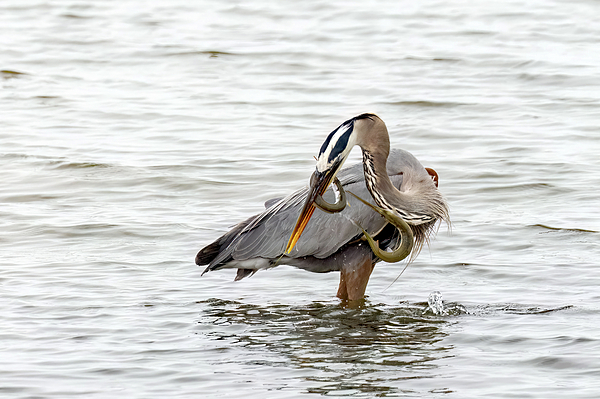 A great blue heron stands in water, wielding a needlefish in its beak, highlighting a moment of a successful hunt. It appears as if a second... more