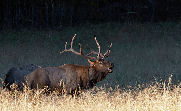 This bull elk had a harem of 20 females. Another bull wandered into the far end of the field. He was no match for this guy. This bull was giving the other bull fair warning. Stay away from my women!